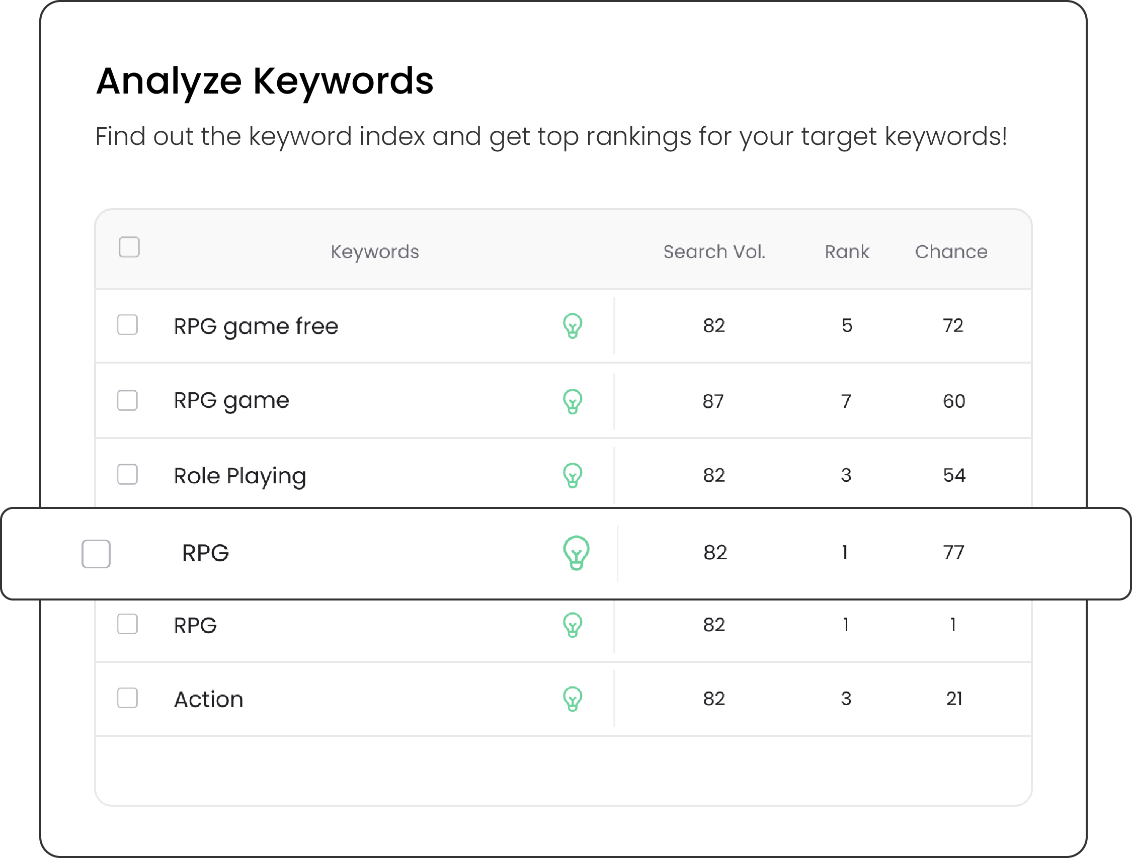 Looking for effective keywords for your apps/games? Have AI do it for you. Use ASO index’s AI Suggestion to promptly get impactful keywords!